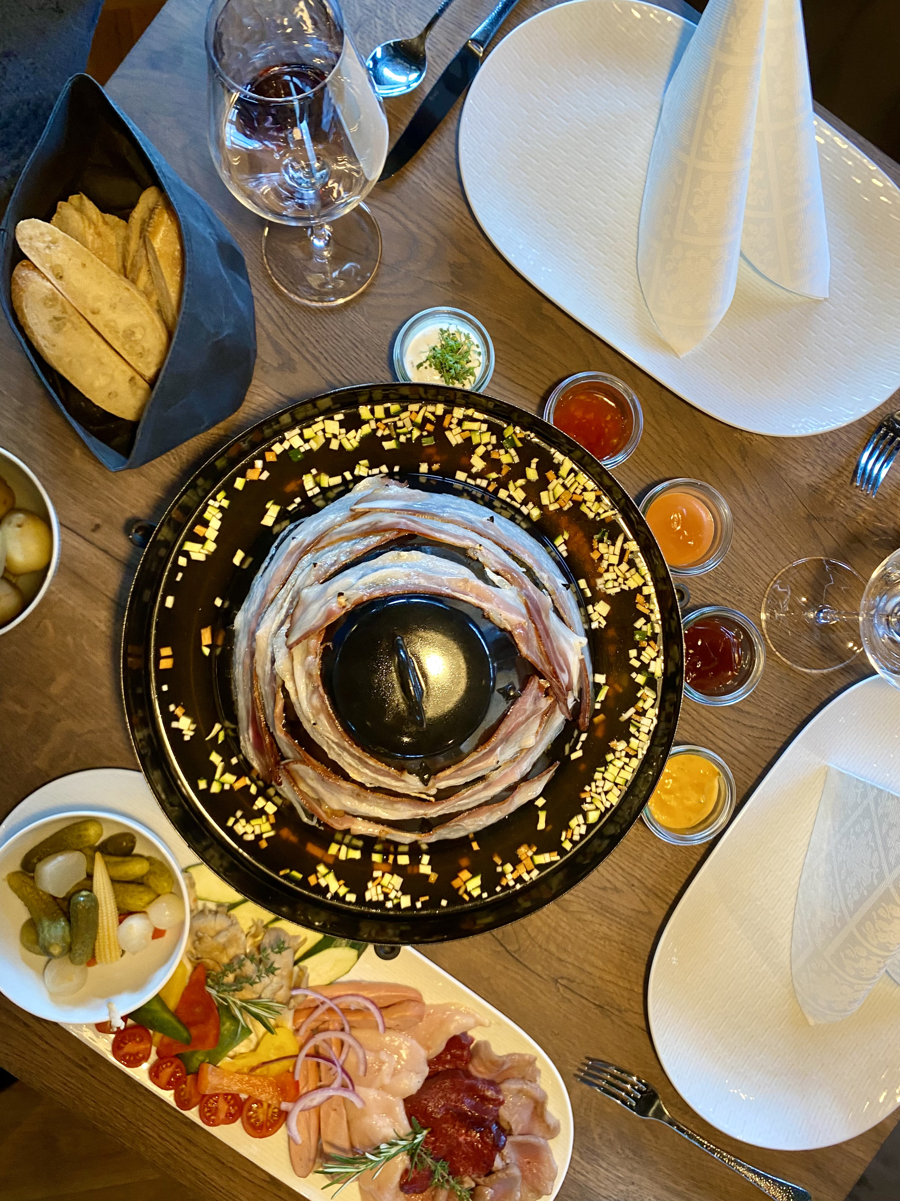 Mit 3erlei Käsesorten, Weißwein, Kirschwasser, MiniKartoffeln, Salat, Bündnerfleisch, Brot!